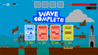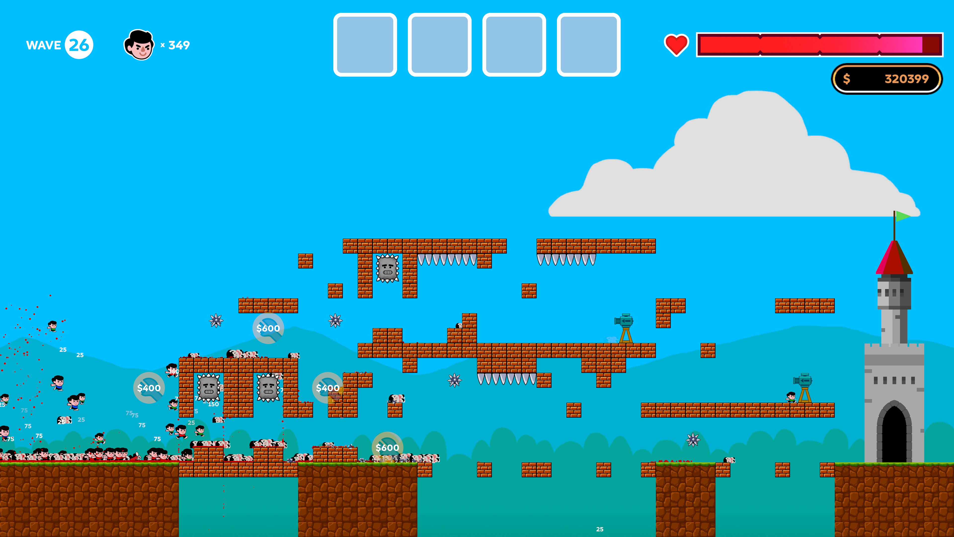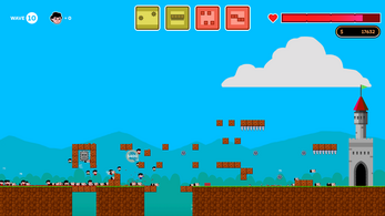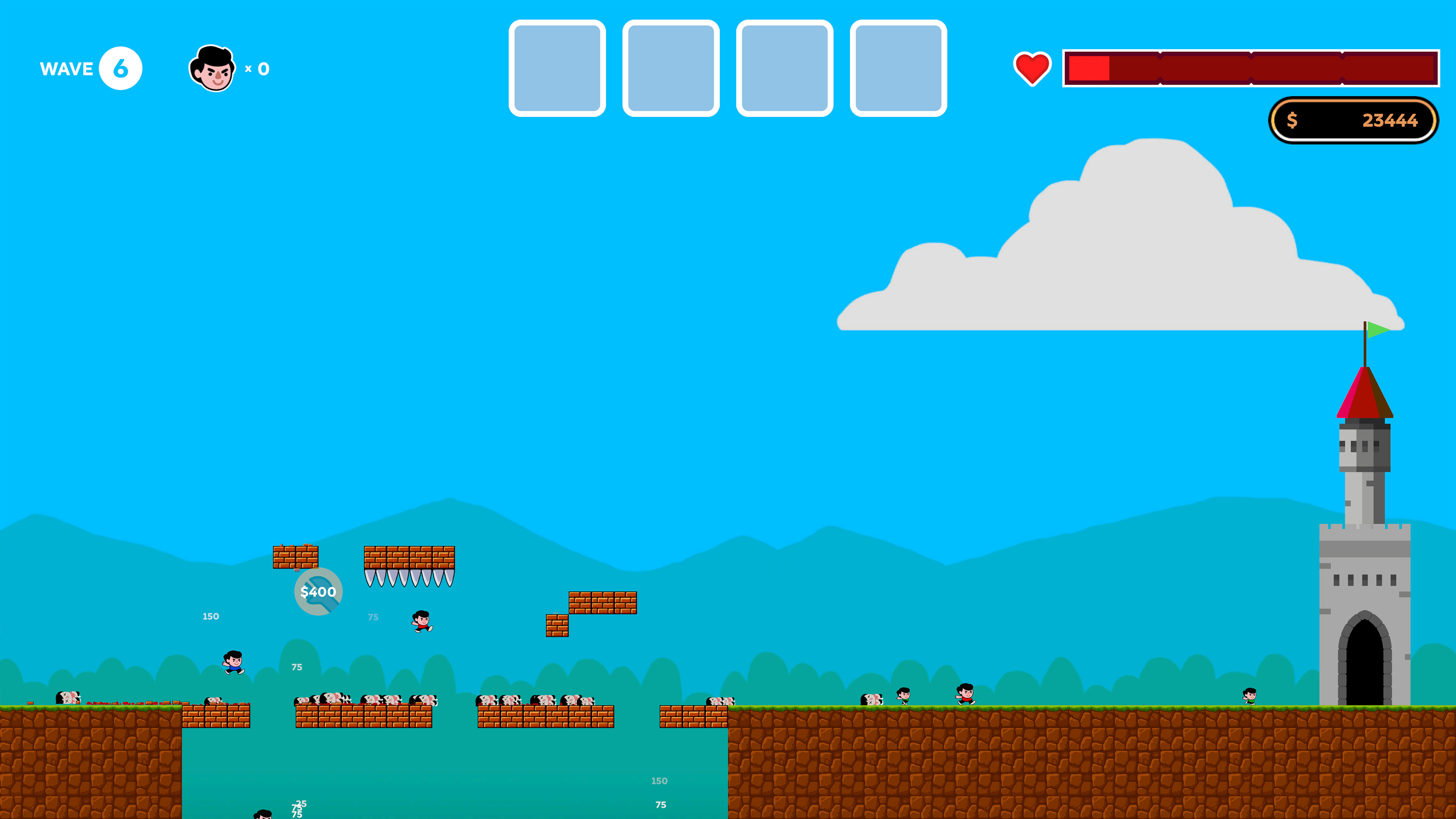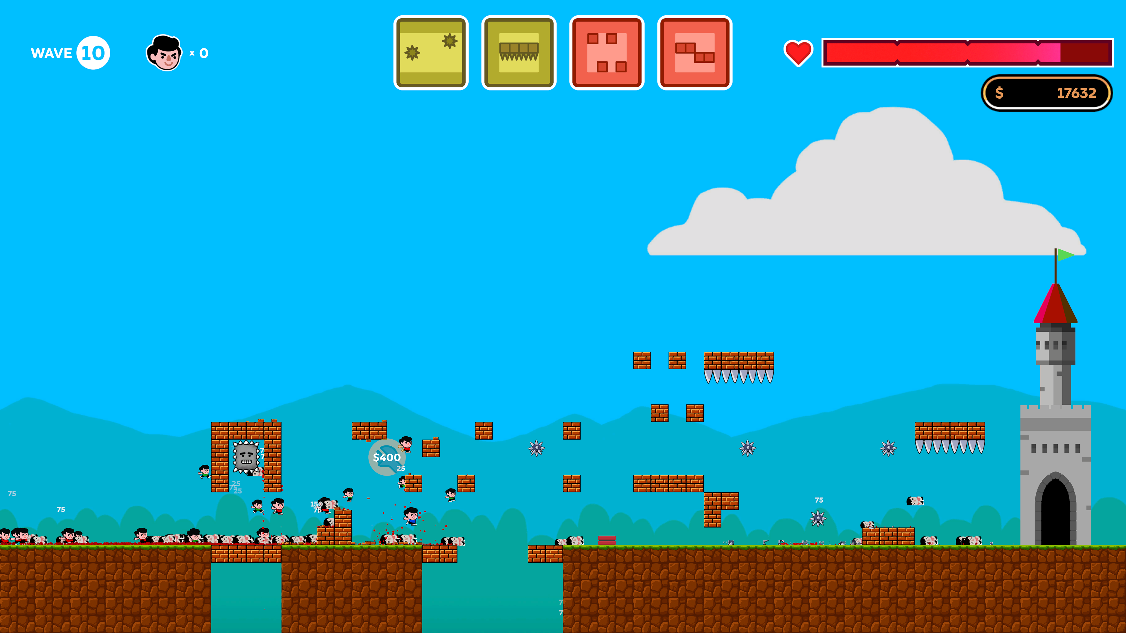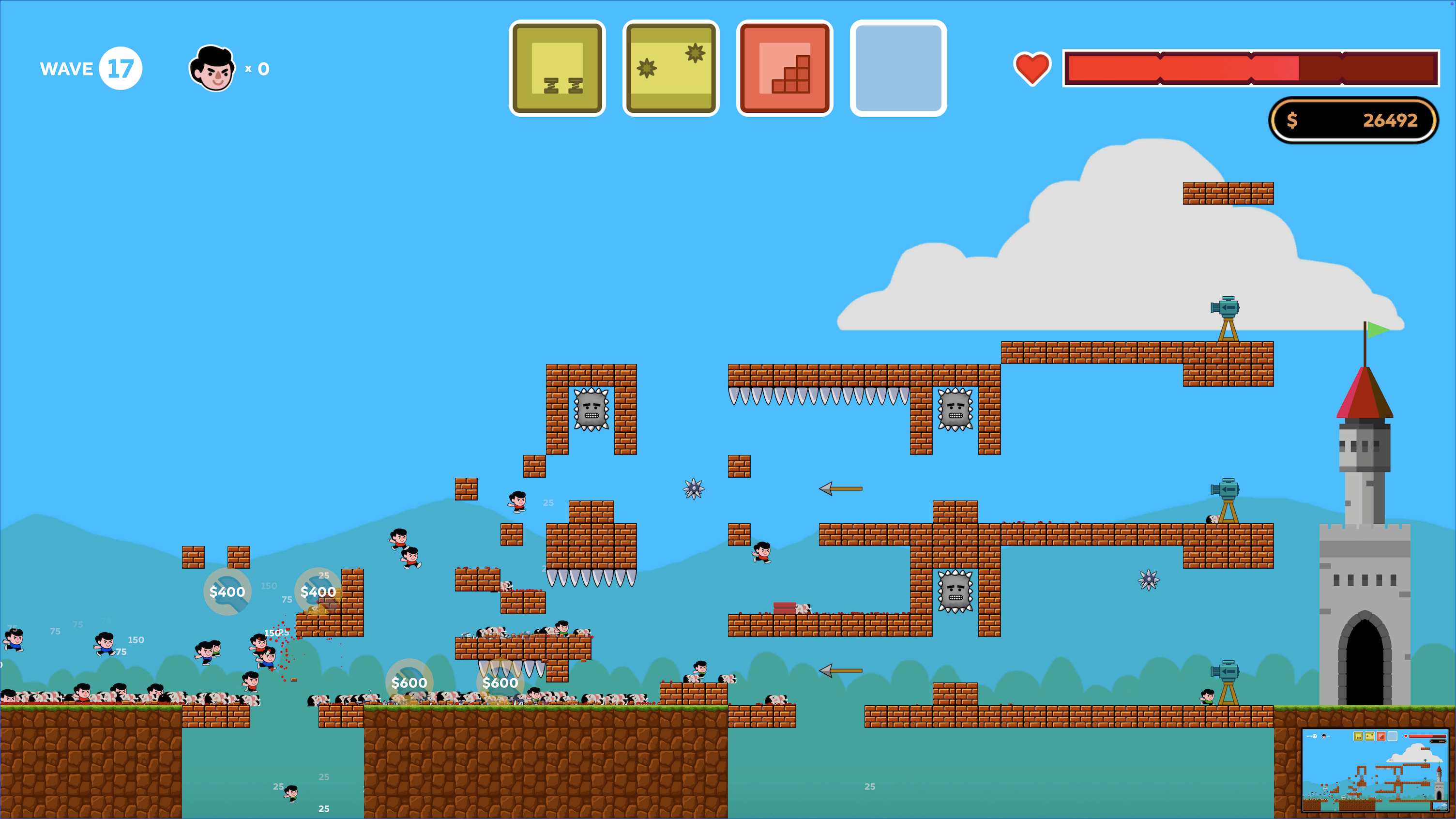 You are the villain in a 2D platformer. Waves of tiny “heroes” are trying to break into your castle and wreak havoc and you have to quickly construct defenses to stop them.